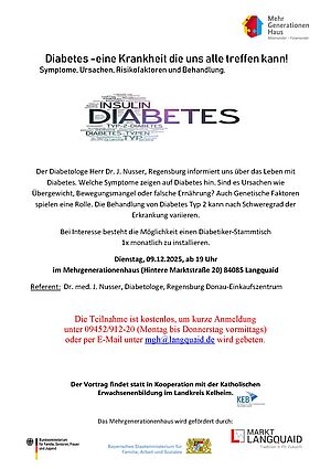 | Anmeldung | Die Teilnahme ist kostenlos, um kurze Anmeldung unter 09452/912-20 (Montag bis Donnerstag vormittags) oder per E-Mail unter mgh@langquaid.de wird gebeten. |